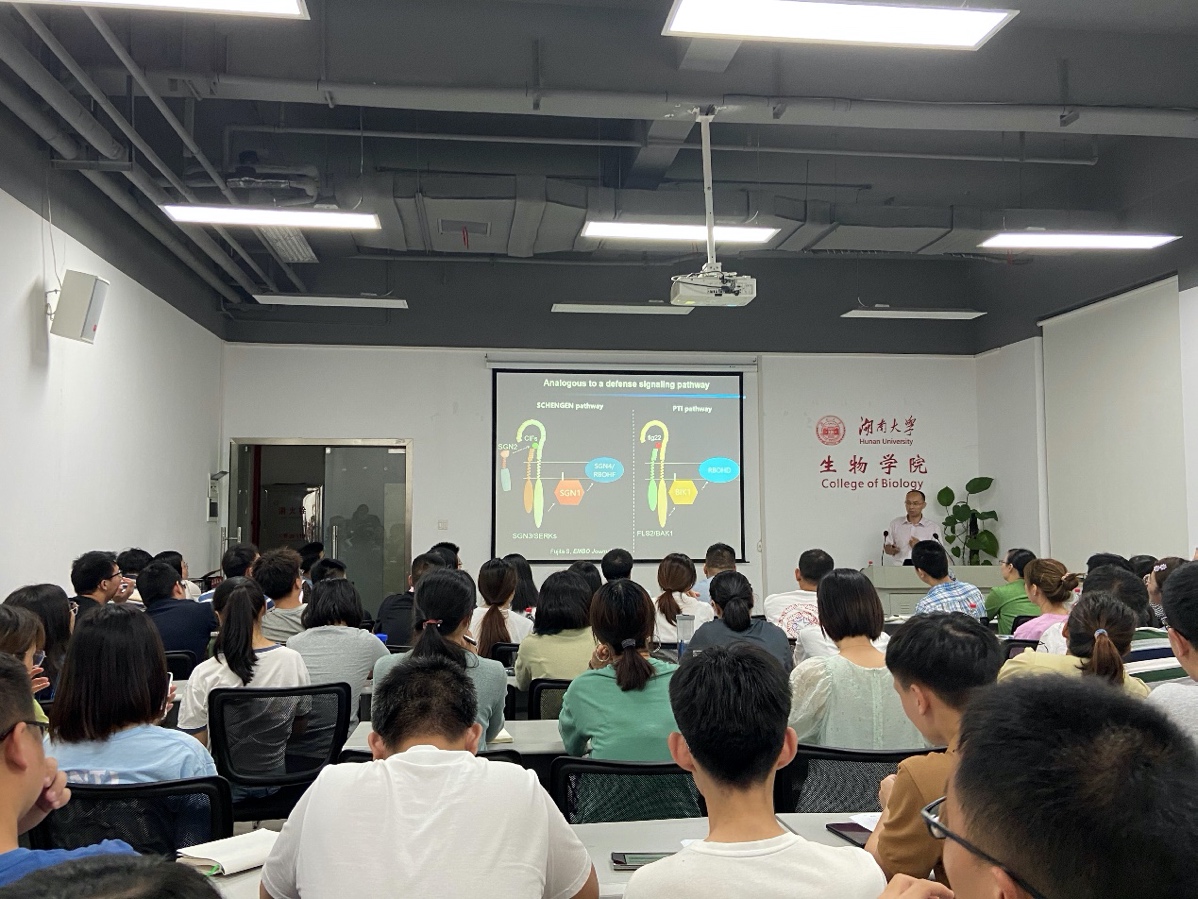 目前有关植物免疫的研究绝大多数都是集中在叶片及分子水平,对根部免疫的研究相对较少,从细胞学角度出发对根系局部免疫响应的了解更是知之甚少。周峰老师的研究主要围绕根系局部免疫可视化开展,在介绍根部免疫前,周老师首先介绍了博士期间的研究工作,讲解了D53基因的克隆及其作为独角金内脂信号途径的重要组分参与分枝生长发育的分子机制;紧接着,周老师就植物根系局部免疫响应进行了详细深入的讲解,介绍了拟南芥根成熟区的免疫响应不仅依赖于免疫激发子PAMP,还需要细胞损伤诱导,植物这种精密的局部免疫响应调节机制为植物如何区分有益和有害微生物从而特异性的启动免疫反应提供了很好的解释。