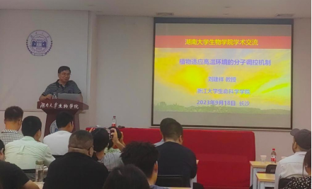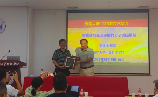 本次报告刘建祥教授以“挽救春姑娘”、“油门和刹车”等故事角度,趣味性给师生们解读了植物热形态建成的机制。首先,刘建祥教授介绍了温和高温下,BBX18招募E3泛素连接酶XBAT31泛素化降解温度传感器ELF3蛋白,解除ELF3对转录因子PIF4的抑制作用,促进植物生长发育的分子机制。然后,介绍了温和高温下RVE5通过竞争缓冲了CCA1对ELF4的抑制作用,从而促进(维持)了ELF4的表达水平,并精细调控温和高温下植物的生长。紧接着,刘建祥教授介绍了两个跨膜转录因子bzip28和bzip60参与水稻响应极端高温胁迫的机制。本次报告非常精彩,既有理论知识又有许多应用实例,生动有趣。问答阶段,刘建祥教授耐心地一一解答了师生的提问,还幽默地讲述了自己求学的经历,以及学术成果背后的励志小故事,现场反响热烈,学术氛围极佳。刘选明教授代表学院赠与刘建祥教授岳麓书院学规刺绣,部分参会老师合影留念。