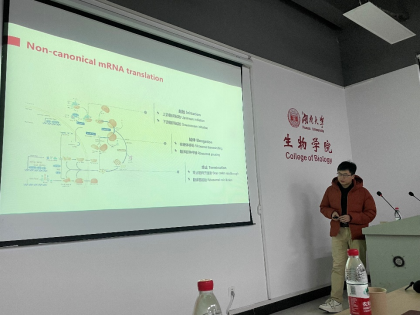 首先,毛老师对真核生物的翻译过程做了初步介绍,讲解了翻译的起始、延伸及终止过程。接着,毛老师为在场的师生分享了翻译调控中的一些异常事件,如CDS上游和下游的翻译起始事件,在翻译延伸过程中的核糖体移码,翻译延伸停顿事件,以及终止密码子通读和翻译重起始事件。