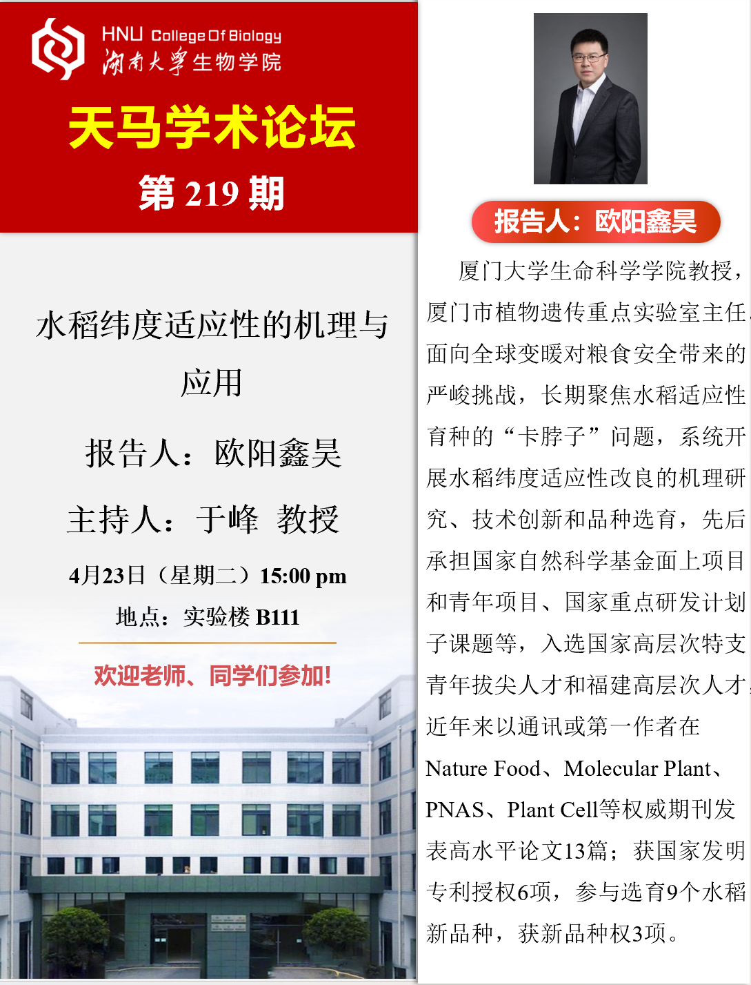 天马学术论坛 第219期 厦门大学生命科学学院教授