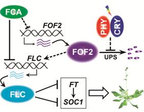 植物开花受光周期、环境温度、植物激素、植物年龄等多种内源和外源信号的影响。植物通过整合内源和外源信号,至少形成了6种不同的开花调控途径:光周期途径、温度途径、春化途径、赤霉素途径、自主开花起始途径以及年龄途径。这些不同开花调控途径之间的联系尚不明确。在此项研究中,作者通过植物转化和大规模筛选,发现F-box基因FOF2过量表达推迟植物开花,但并不影响植物开花的光周期响应。那么FOF2通过哪条途径调控开花?作者通过检测不同开花途径对FOF2基因表达的调节,发现FOF2受自主开花途径基因FCA的调节,表明FOF2可能影响自主开花调控途径。那么FOF2调控开花的机制是什么?作者通过RNA-seq、遗传及分子生物学手段,证明FOF2通过促进开花抑制子FLC的表达,抑制开花。此项研究还发现,蓝光受体隐花素(CRY)和红光/远红光受体光敏素(PHY)介导光抑制FOF2蛋白的泛素化降解。作者推测,光可能通过调节FOF2蛋白水平,进而调控自主开花途径,因而暗示了光与自主调控开花途径间的联系。