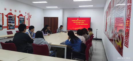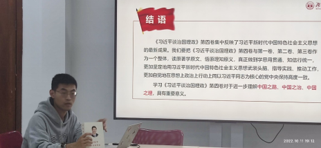 研究生第四党支部支部书记刘立果进行了背景介绍,其中重点指出“《习近平谈治国理政》集中展现了马克思主义中国化的最新成果,充分体现了我们党为推动构建人类命运共同体、共建美好世界作出的最新贡献,是全面系统反映习近平新时代中国特色社会主义思想的权威著作”。