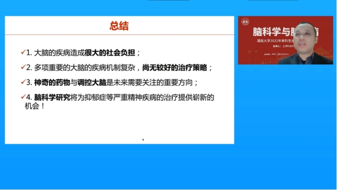胡教授的讲座分为脑科学与脑疾病两部分。胡教授先从人类理解大脑的过程入题开始讲述了脑科学的重要性与脑科学的起源。从形态与功能的角度讲述了大脑中的神经元、浦肯野细胞和吊灯细胞等神经细胞,大脑的基本组织方式,大脑的功能分区;还介绍了目前他自己课题组正在开展的研究工作和对脑科学未来研究方向的展望并对脑科学部分的内容进行了总结。胡教授向同学们科普了脑疾病相关内容,详细介绍了神经退行性疾病(如阿尔兹海默症等),神经发育疾病(如自闭症等),精神障碍(如抑郁症等),指出脑科学研究有望为人类脑疾病的治疗提供新机会,在课程的末尾对脑疾病部分的讲座进行了总结。