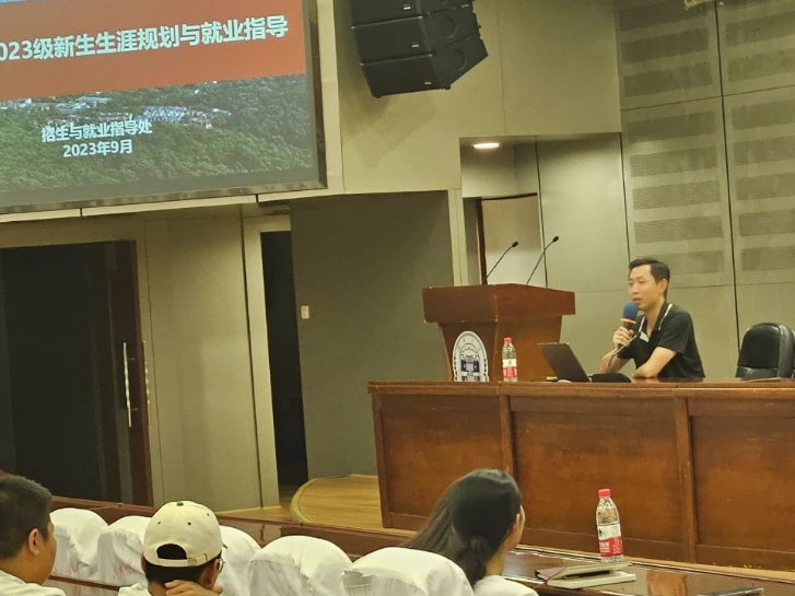 2023级新生入学教育讲座在逸夫楼举行,学院研究生辅导员冉晓芬、本科生辅导员于淼漪、2023级全体本研新生参加讲座。