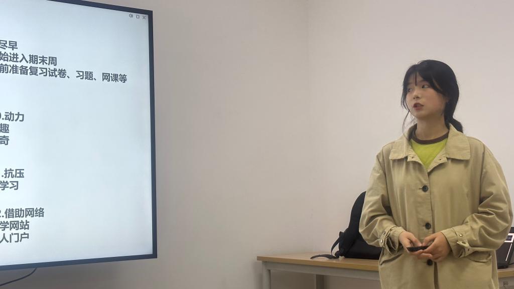 张晟同学分别从成绩、学习、备考和建议进行分享。对于成绩方面,张晟同学表示本科生应提高重视度,明确其对于保研的重要性。有关学习方面,她提醒大家明确各科目老师的评分标准,有目的有针对性地进行学习。同时,她为大家提供了许多有趣的缓解学习压力和集中注意力的方法,帮助大家轻松高效地学习。