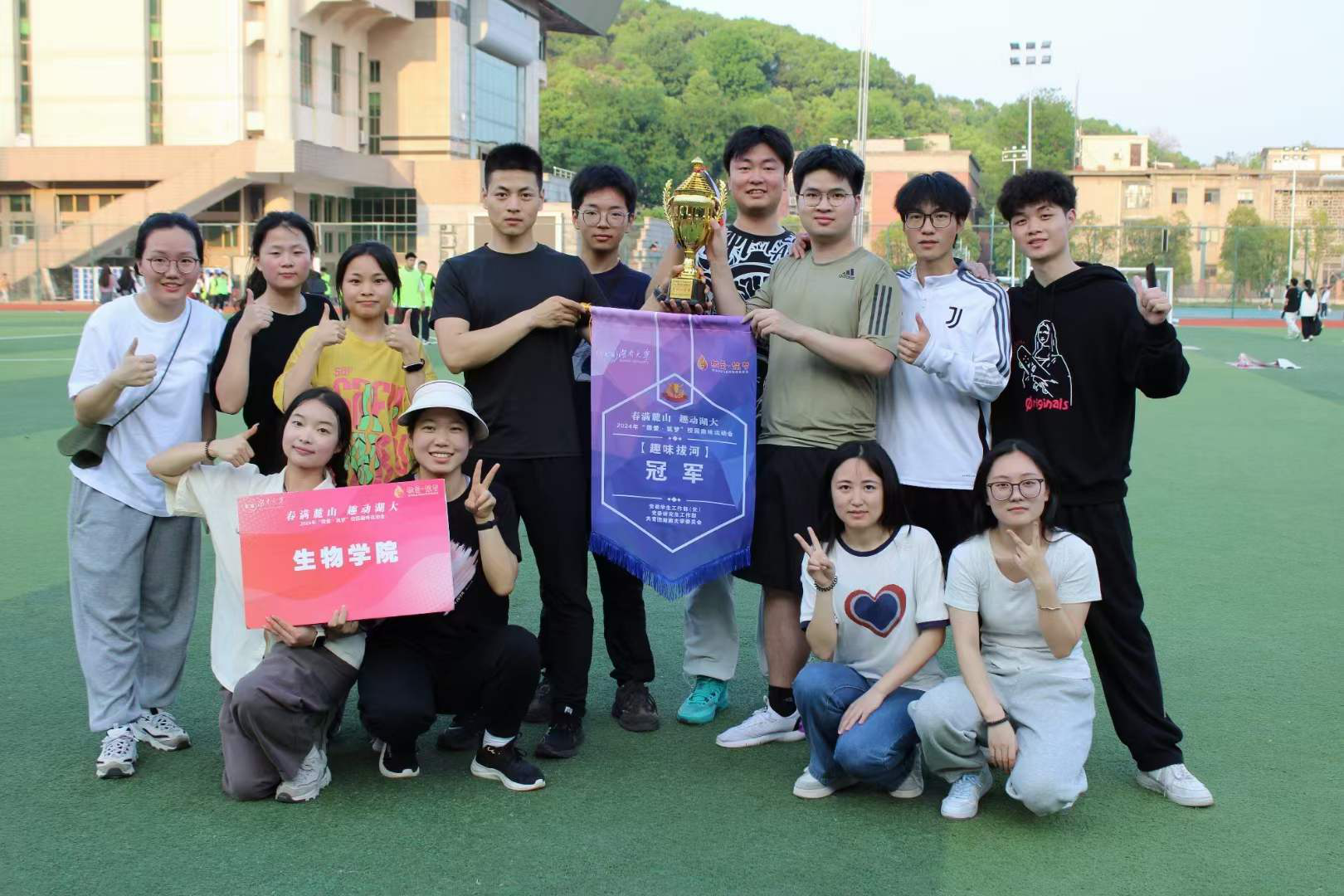急需一场胜利装点门面。正因如此,上一个项目留下的遗憾不仅没有消磨我们的意志,反而成了我们向上进取的养分。在最后一项“趣味拔河“项目中,队员们目光炙热,努力尝试抓住稍纵即逝的获胜契机,最终在指挥的冷静调动、队员的全力配合下,经过三轮鏖战,生物院淘汰了其他如狼似虎的对手,捧起最后一座奖杯。我们用擦破的手掌、力竭的肌肉、满含热泪的双眼诠释了何谓”木叶飞舞之处、我辈生生不息“。