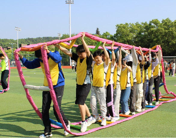 要在人数基础雄厚大院中脱颖而出并不容易,需要项目领队在项目开始前积极组织,努力寻找项目取胜的技巧,就如在“勇往直前“项目中,师生们根据队员的身高分成两队,提前协商口号,努力提升速度的同时保持步调一致,并成功拿下该项目第四轮的第一。同样的方法使我们在”携手并进“项目中崭露头角;”众志成城“项目要求队员们借助道具,如履带般滚滚向前,极度考验队员们的默契配合度;