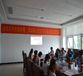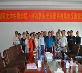 -津湘药业党建共建基地的揭牌仪式暨党建工作交流活动。学院党委书记徐晓波、党委委员副院长何晓晓和津湘药业的党支部书记副总经理彭莹及其支部成员参加了活动。