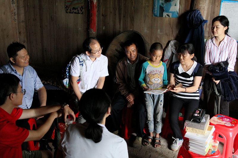 支部成员在帮扶对象潘久仁家鼓励小儿子好好念书