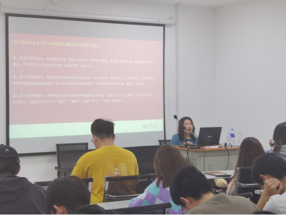 随后,她向大家介绍了中华全国学生联合会章程和关于学联会工作人员改进作风服务同学的多条规定,并强调学生会工作人员应该努力改进作风,牢记服务宗旨。