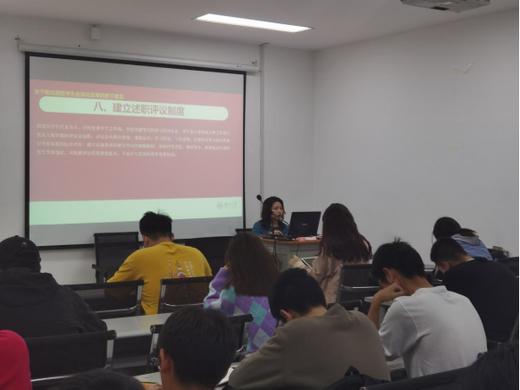 接下来,由调研部部长白怡凡为大家讲解,她重点讲解了高校学生会的规章制度和作风建设两大类。她从明确职能定位、改革运行机制、坚持精简原则、明确遴选条件等多个方面对推动高校学生会深化改革进行全面讲述,涵盖了关于落实共青团和学联对高校学生会指导管理责任的多条规定,以及加强和改进新时代学联学生会工作实施方案。