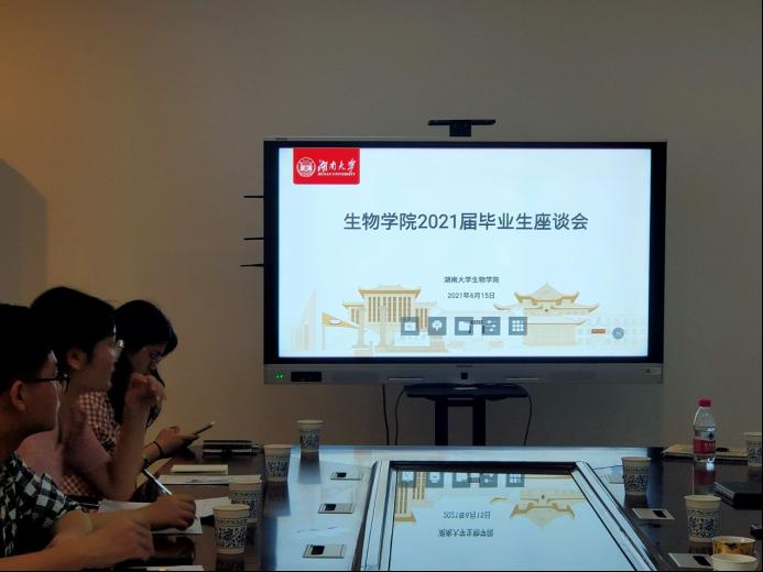 于办公楼306会议室召开2021届毕业生座谈会。会议由学院党委副书记陈树芸主持,学院党委书记李勇军、副院长何晓晓、副院长涂海军、院长助理兼生命科学系主任姚瑞枫、生物医学系副主任邱烨、辅导员刘浩、冉晓芬以及毕业班代表参加座谈会。