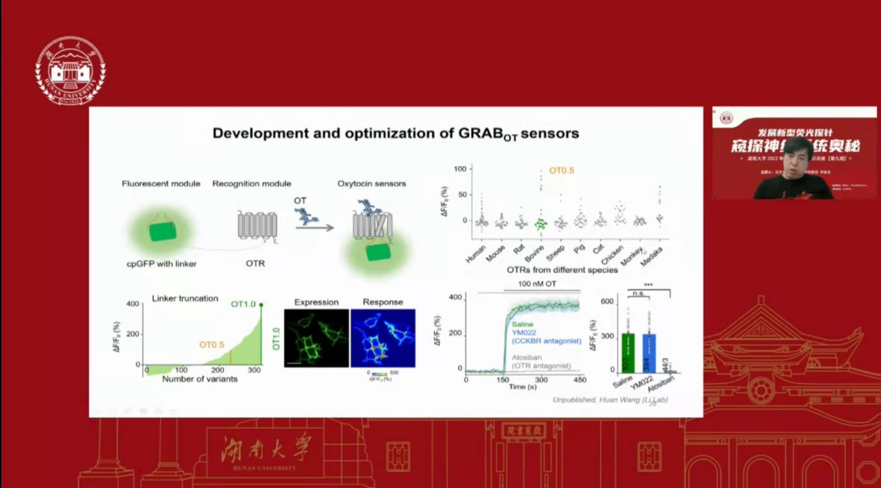 接着李教授又讲了前列腺素、催产素等神经调节物质,比如催产素不仅能在轴突释放,还可以在树突、胞体释放,并且分子机制各不相同,但是通过探针就可以区分不同的催产素,以便更好的调节催产素的释放。
