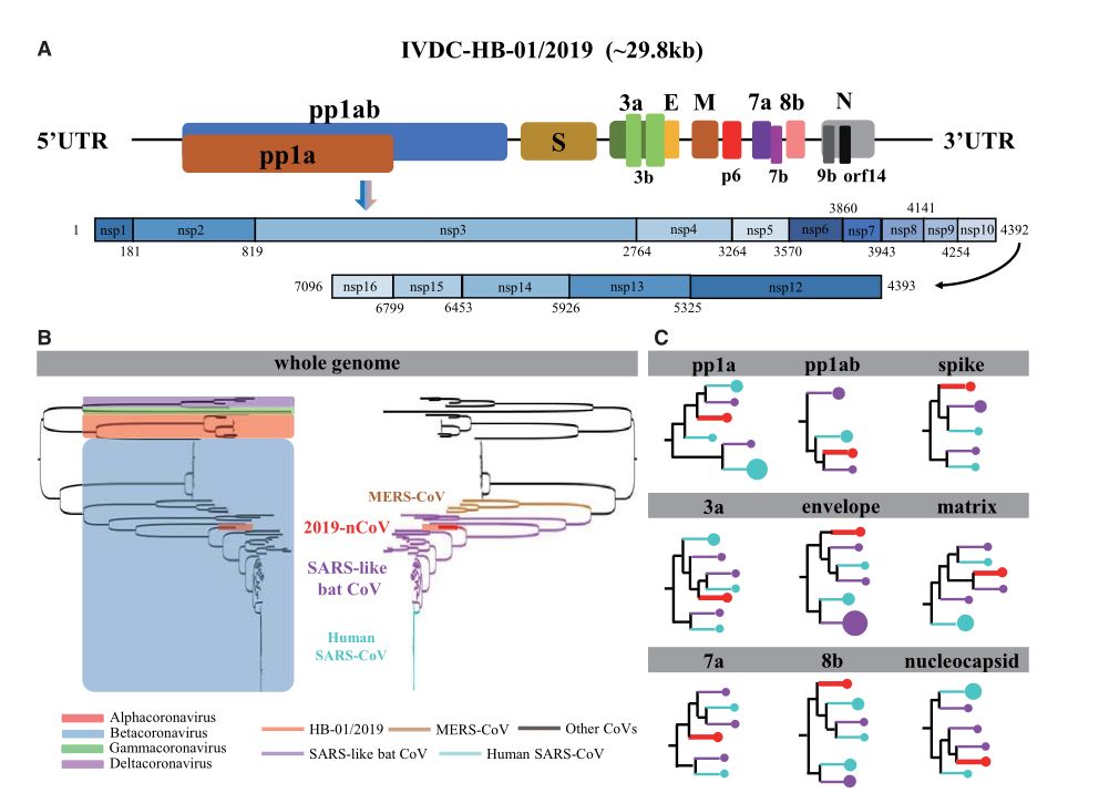 该研究对2019-nCoV已确定的三个基因组和相关冠状病毒的基因序列进行比较,其中包括1008条人SARS冠状病毒序列、338条蝙蝠SARS样冠状病毒序列和3131条人中东呼吸综合征(MERS)冠状病毒序列,发现这三株2019-nCoV病毒的基因组序列几乎相同(约29.8kb核苷酸的基因组中只有5个核苷酸差异),与蝙蝠SARS样冠状病毒的关系比与人SARS冠状病毒或人类MERS冠状病毒更为相近。