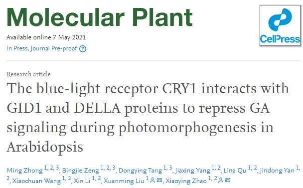 赵小英/刘选明课题组题为“The blue-light receptor CRY1 interacts with GID1 and DELLA proteins to repress GA signaling during photomorphogenesis in Arabidopsis”的研究论文。该研究报道了蓝光受体CRY1能够与GA受体GID1和GA信号关键抑制因子DELLA蛋白以蓝光依赖的方式直接结合,进而抑制GA信号和促进光形态建成的新机制。
