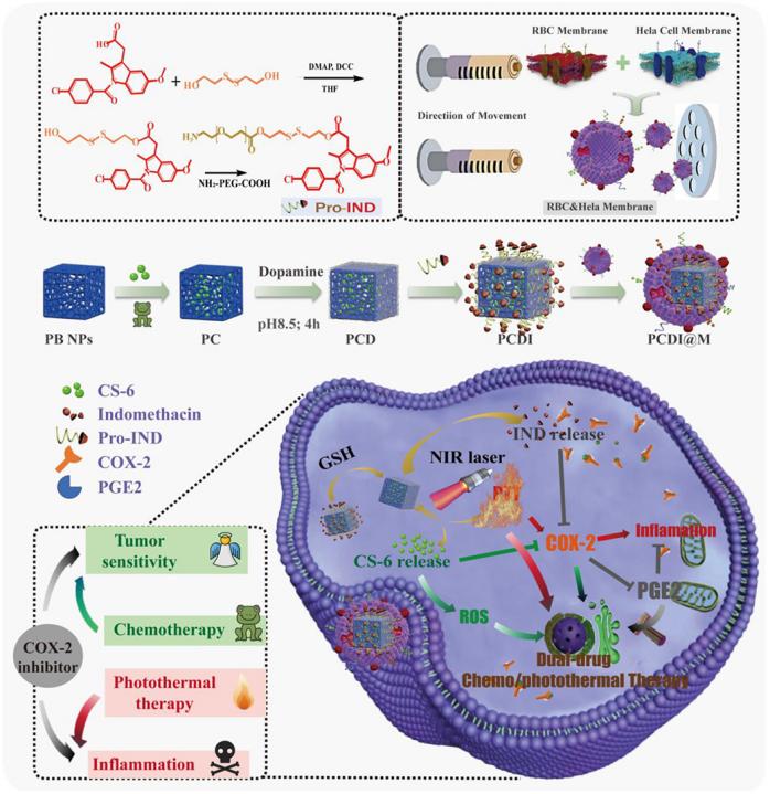 基于课题组前期对光热疗法、蟾蜍来源天然化合物日蟾毒他灵(CS-6)的研究基础上(Biomaterials, 2020, 243:119936; Biomaterials, 2019, 217: 119301; Acta Biomaterialia, 2020, 113: 554-569等),我们提出利用吲哚美辛抑制维持肿瘤炎症微环境的关键酶蛋白COX-2的表达水平,进一步提高日蟾毒他灵(CS-6)与光热疗法联合抗肿瘤疗效的设想,构建了一种基于普鲁士蓝纳米颗粒的抗宫颈癌的前药体系,在荷瘤小鼠模型上取得显著疗效,为发展可用于宫颈癌多模式治疗技术奠定了良好的研究基础。近日,该研究工作在线发表在生物医药领域顶级期刊Journal of Controlled Release(10.1016/j.jconrel.2021.09.034),并已同步申请专利。论文第一作者为ebook漫画