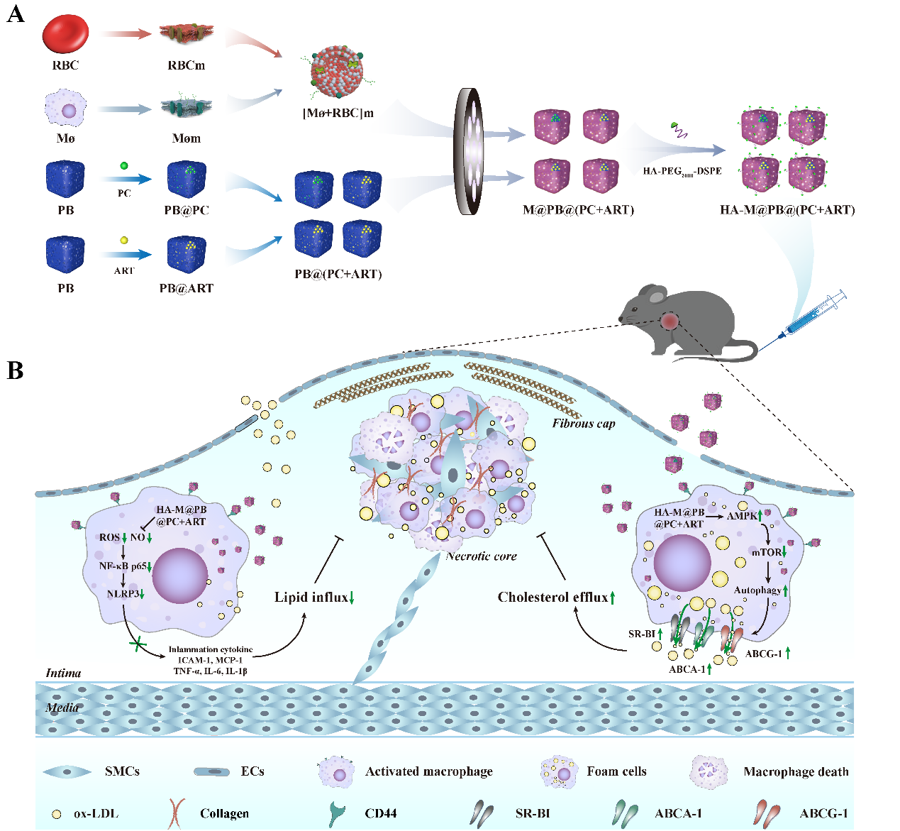 课题组针对蟾酥、青蒿素、花青素等系列天然化合物开展了活性筛选、作用机制和纳米制剂化研究,取得丰富的研究基础(在Journal of Controlled Release;Biomaterials;Biomaterial Science等期刊发表研究论文30余篇)。机制研究发现青蒿素(ART)可以通过调节巨噬细胞中的AMPK/NF-κB/NLRP3通路来抑制脂质流入及炎症产生和原花青素(PC)可以激活III类PI3K/Beclin1复合物介导的自噬促进ATP结合盒转运蛋白A1(ABCA1)介导的胆固醇流出来抑制泡沫细胞的形成。结合普鲁士蓝纳米颗粒(PB NPs)高载药效率、溶解性好、成本低,优越纳米酶活性等优点,有效解决了单纯药物体内半衰期短、生物利用度较低、对抗疾病疗效有限的缺点。通过优化组合两种药物给药浓度和递送方式,实现同步调控脂质流入和胆固醇流出,在8周低剂量预防性治疗或1周高剂量治疗性治疗呈现出显著的抗动脉粥样硬化效果。