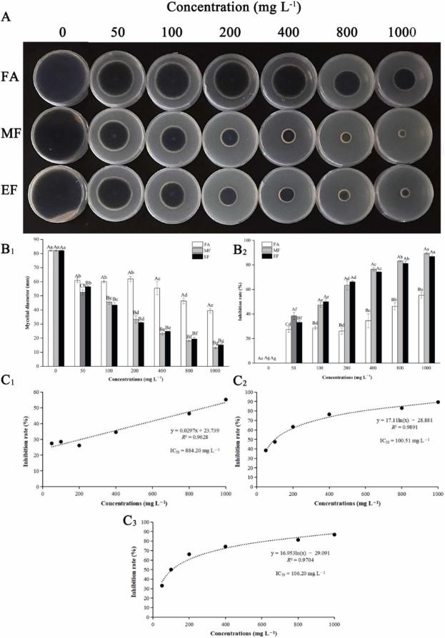 图1FA、MF和EF对链格孢菌体外菌丝生长的影响