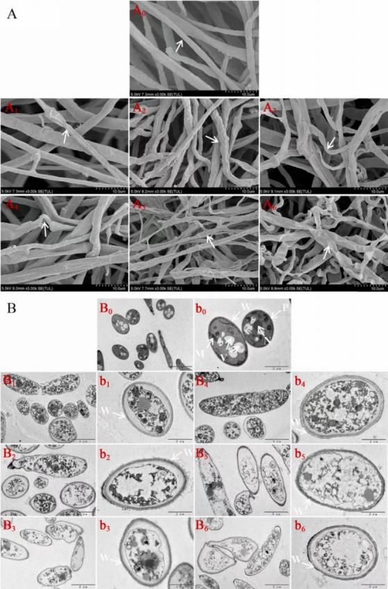 图2FA、MF和EF对链格孢菌表面形态和超微结构的影响(A)扫描电镜图,(B)透射电镜图