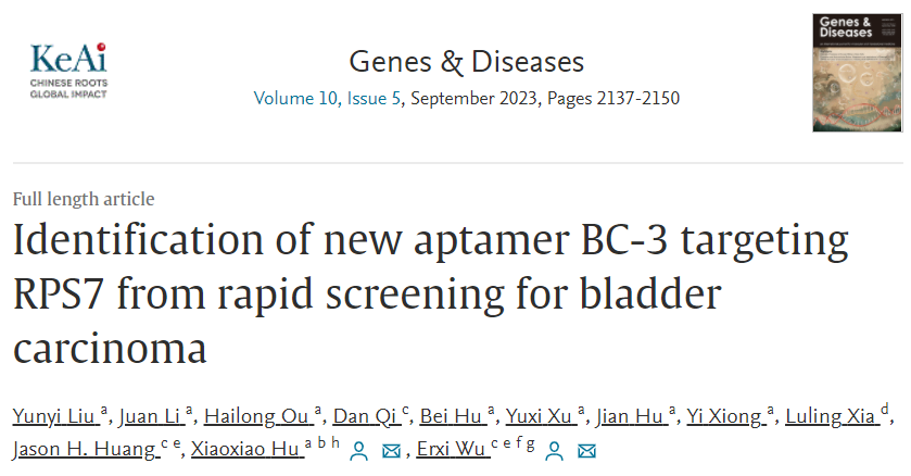 胡小晓课题组也通过X-aptamer技术进行细胞筛选获得一条膀胱癌特异性的核酸适体BC-3,初步考察其性质并鉴定其靶标为RPS7。核糖体蛋白的异常表达可诱发肿瘤等疾病的发生,因此通过分子探针识别或靶向RPS7可以针对膀胱癌提供一种新的诊断和治疗途径。相关研究论文“Identification of new aptamer BC-3 targeting RPS7 from rapid screening for bladder carcinoma”在《Genes & Diseases》期刊(生物化学与分子生物学,Q1)上发表,ebook漫画