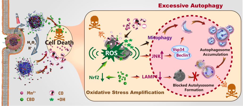 1)发现大麻来源的活性小分子CBD调控TNBC细胞的自噬进程。基于CBD和CO供体构建了仿生CBD协同CO纳米制剂,利用CBD对Nrf2的调控放大CO对线粒体的氧化应激刺激。其次,纳米制剂通过调控ROS/JNK/Beclin1通路和下调LAMP1增强自噬小体的积累和破坏自噬溶酶体的形成,最终导致细胞过度自噬而改善TNBC治疗。相关工作于2023年5月发表于Acta Pharmaceutica Sinica B杂志,论文第一作者为博士生肖畅,通讯作者为ebook漫画