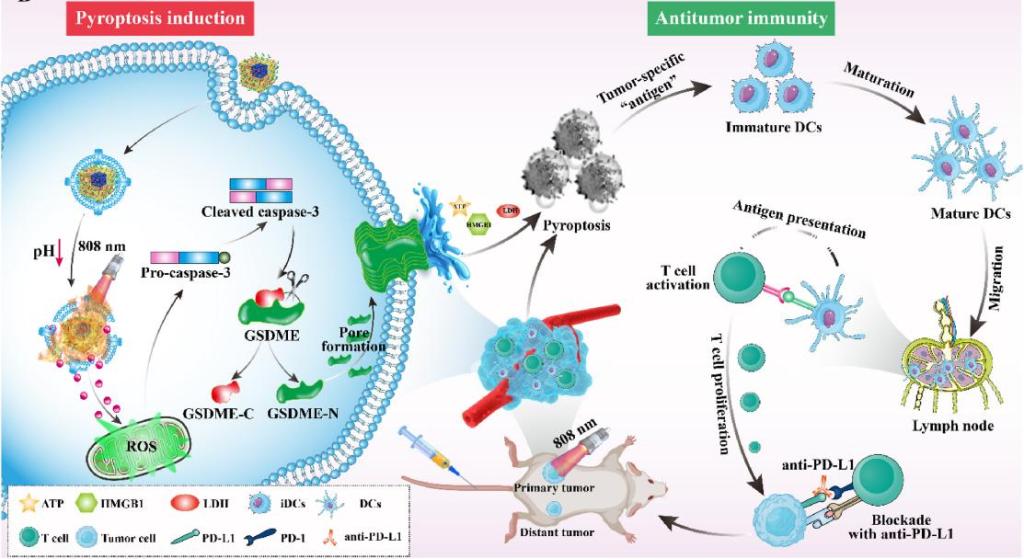 2)蟾酥系列活性小分子CS-1在TNBC细胞中不仅抑制肿瘤细胞增殖和侵袭转移。重要的是,发现CS-1通过Caspase3/ GSDME途径有效杀伤TNBC细胞焦亡。基于CS-1和普鲁士蓝载体构建了CS-1的光响应型仿生普鲁士蓝纳米制剂,光热协同焦亡促进TNBC细胞释放促炎细胞因子和免疫原性成分,导致ICD,促进“热”肿瘤微环境形成。联合PD-L1抑制剂,极大增强TNBC的免疫治疗。相关工作于2023年10月发表于Biomaterials杂志,论文第一作者为助理教授龙樱、博士后范家龙和硕士生周纳多,通讯作者为ebook漫画
