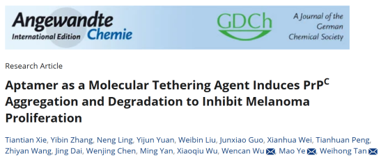 谭蔚泓院士/叶茂教授团队在Angewandte Chemie International Edition在线发表了题为“Aptamer as a molecular tethering agent induces PrPC aggregation and degradation to inhibit melanoma proliferation”的研究论文。该研究首次证实,基于核酸适体构建的分子束缚剂,可通过诱导黑色素瘤中细胞阮蛋白(PrPC)的非天然聚集,激活细胞内蛋白质量控制系统,促进PrPC的溶酶体途径降解,实现抗黑色素瘤的功能活性。这一研究不仅为开发靶向PrPC的抗肿瘤药物奠定了理论基础,而且为发展新型靶向蛋白降解策略提供了重要科学依据。