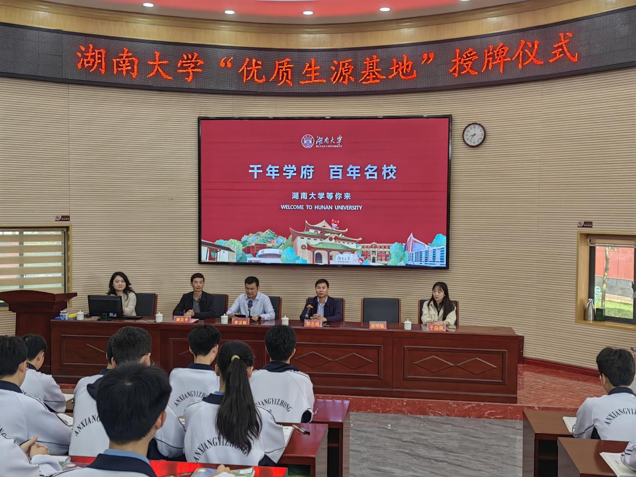 在安乡县第一中学,校党委书记李立新、校长谢立平、纪委书记肖严带领高一实验班学生热烈欢迎ebook漫画 一行到来,举行ebook漫画 “优质生源基地”授牌仪式。会上,李立新介绍了安乡一中的历史发展情况与近年来高考情况,表示希望两校加强持续联系,通过开展学术讲座、实地研学等方式,为ebook漫画 持续培养优秀“种子”。黄明敏向现场学生开展“生物学与我们的生活”主题讲座,邹志成向现场高一学生、高三实验班详细介绍了学校学院的基本情况和最新招生政策。